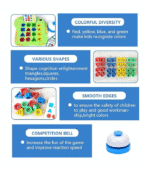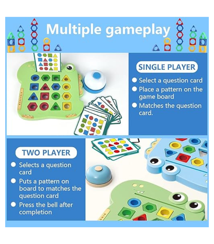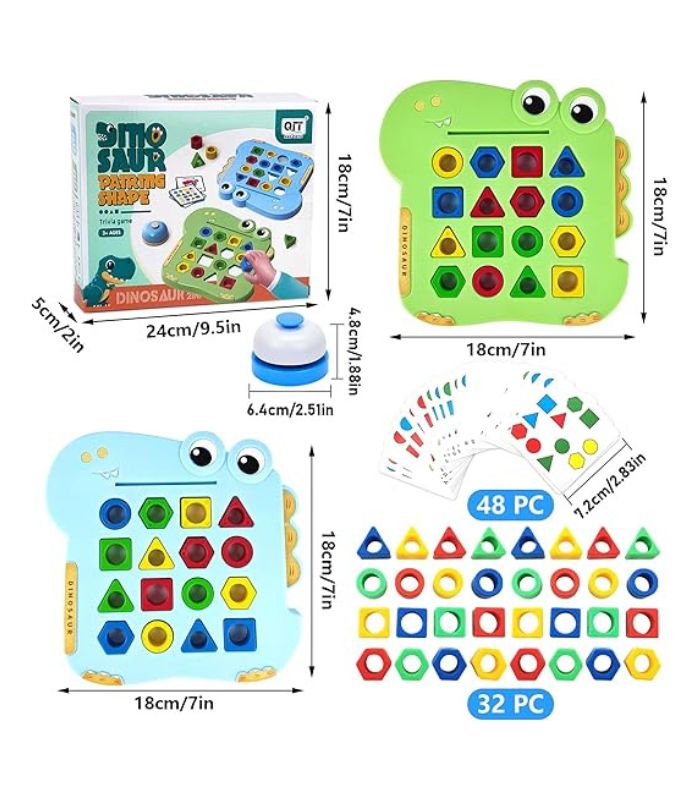 Featuring 30 different style challenge cards, kids use quick thinking and visual focus to match the shapes and colors onto a dinosaur-shaped board. Perfect for solo play or with a friend or parent.