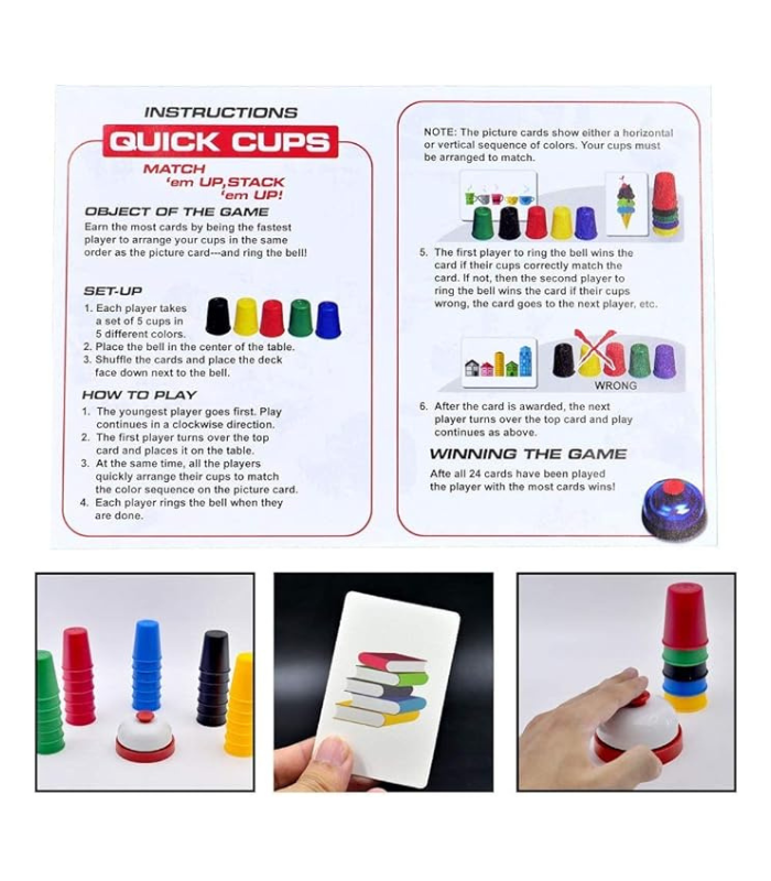 تعتمد اللعبة على التحدي بين اللاعبين لترتيب الكؤوس بالألوان الصحيحة وفقًا للبطاقات أو النرد، مما يعزز التفكير البصري والانتباه والقدرة على المنافسة.